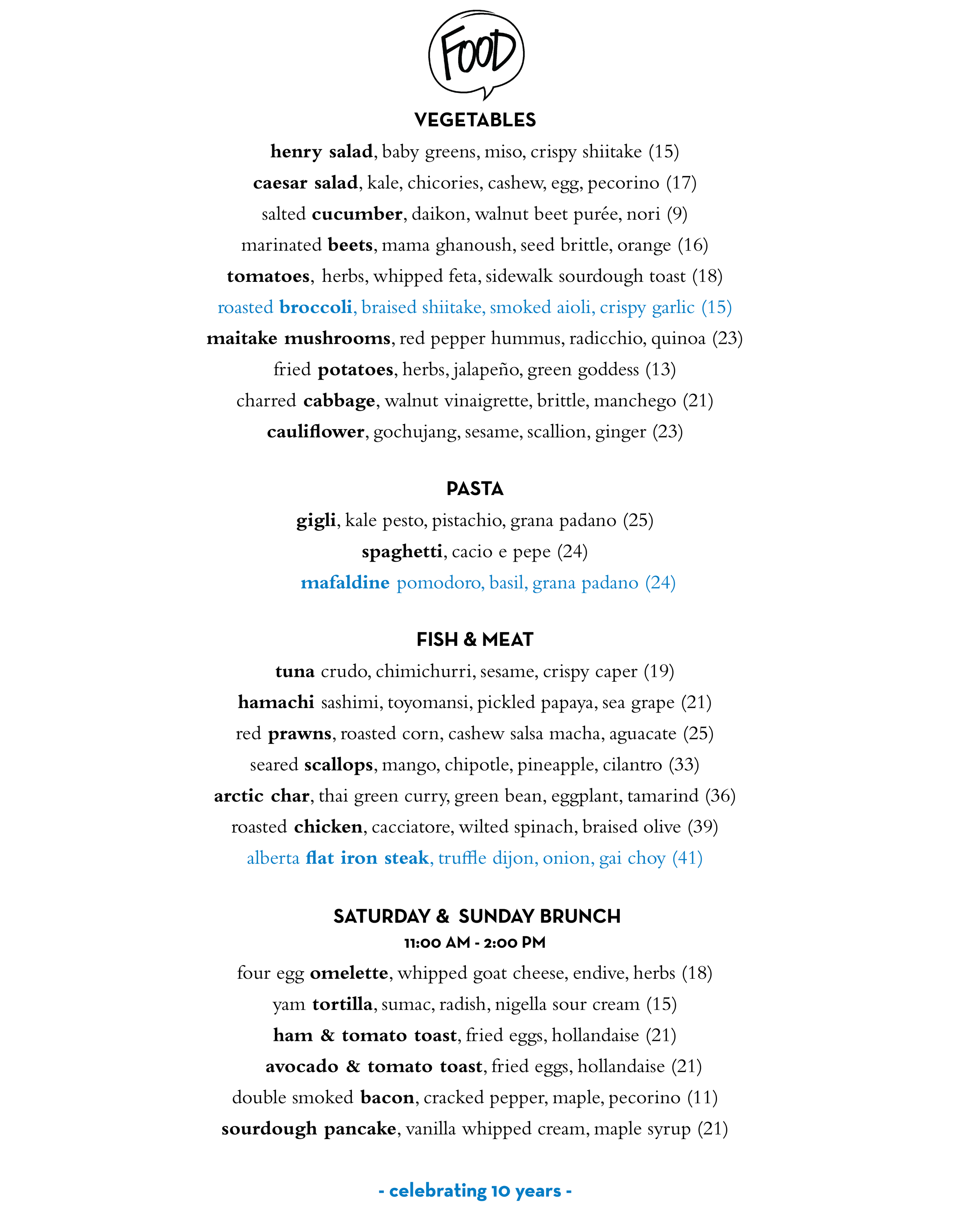 Ten Foot Henry is an all-day-restaurant that offers a fresh vegetable-anchored menu and fun, family style dining. We bridge the gap between what you should be eating and what you really want to eat. We are open every day from 11am - 11pm. We offer a brunch card in addition to our regular menu on Saturdays and Sundays until 2pm. While reservations are encouraged, we happily welcome walk-ins!